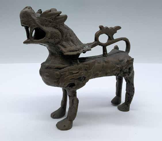 This heavy metal piece depicts a foo dog. These guardian lions are a traditional Chinese architectural ornament.