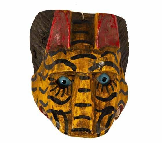 This beautiful hand-made mask is colored with vibrant, orange, red, and green depicting the legendary jungle cat.