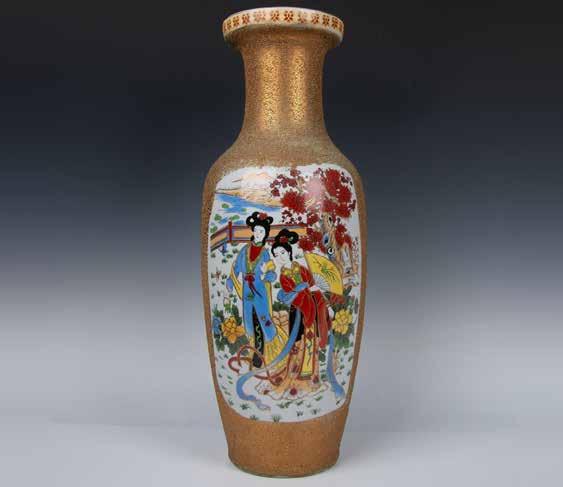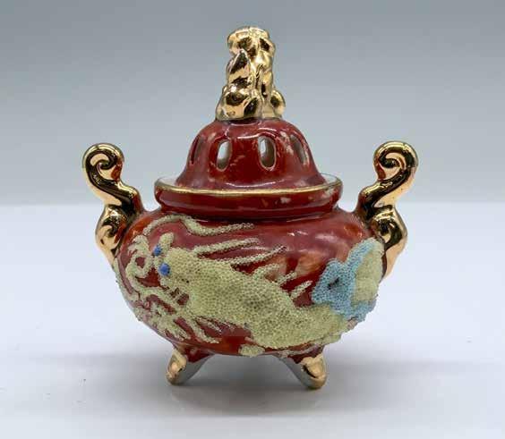 Light blue body with various scenes of people doing multiple things and unusual Foo Dog handles on the sides. Measures 12”H x 9”L x 6”W.