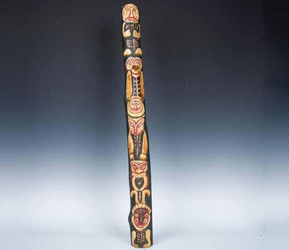 This hand-carved piece features vibrant polychrome decorations depicting humanoid, bird, and animal figures. Crafted from the center part of a tree, it’s roughly the size of a walking stick, ideal for decorative display.