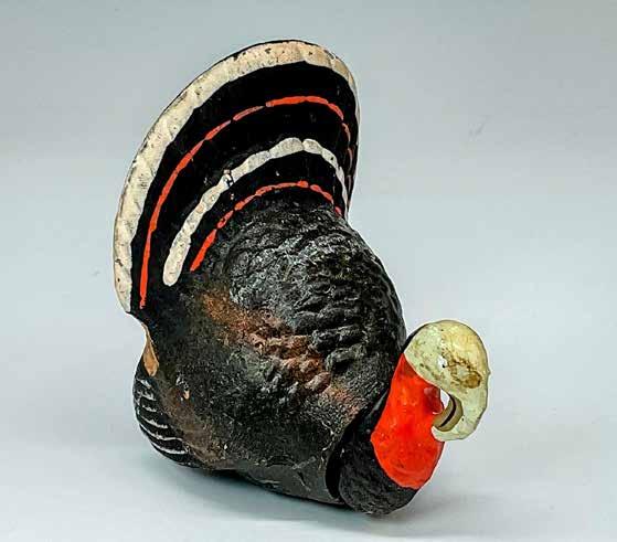 Made from paper mache to look like a turkey, hand painted, head piece comes off to allow candy placement into container.
