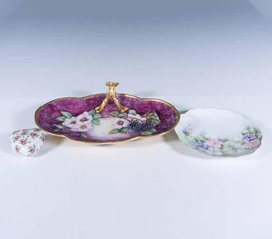 Includes a gilt trim William Guerin Limoges tray adorned with hand painted black raspberry, a small LeClair Limoges heart-shaped covered box with pink roses, and a hand painted floral tray with gilt scalloped rim and signed by E. Trost. The largest piece, William Guerin, measures: 10.75”L x 7”W x 2.5”H.