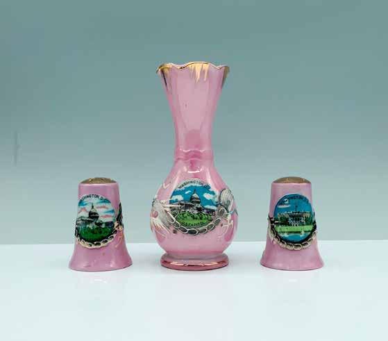 A set of 3 pink kitchen items that are decorated with copper-colored accents with the main design being a central art piece of Washington D.C on each item over a raised dragon. Dimensions of the largest item: 6.25”H x 3” dia.