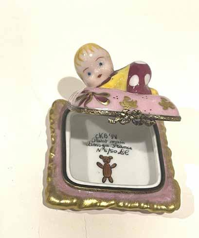 Beautifully crafted, vibrantly hand painted hinged mini box has platinum metallic accents. A gilded crown clasp reveals a matching flag to his shield. Peint Main Limoges France. MB 6 of 50 MF back stamp.