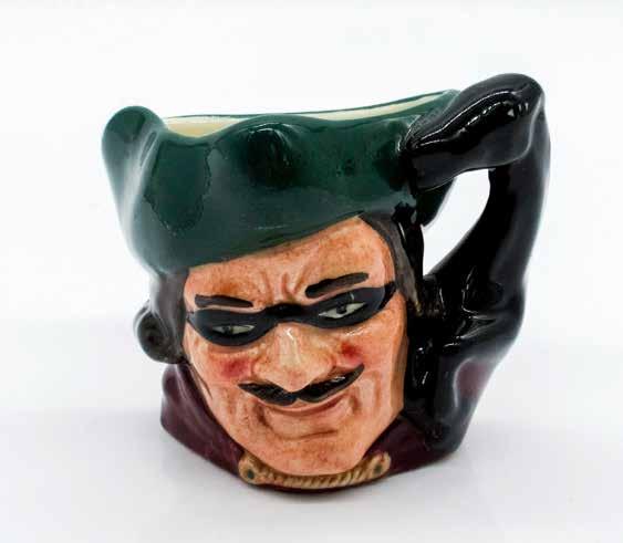 Hand painted and glazed miniature jugs modelled as Dick Turpin in mask D6542, The Sleuth D6639, Bacchus D6521, The Gardener D6638. Royal Doulton backstamp.
