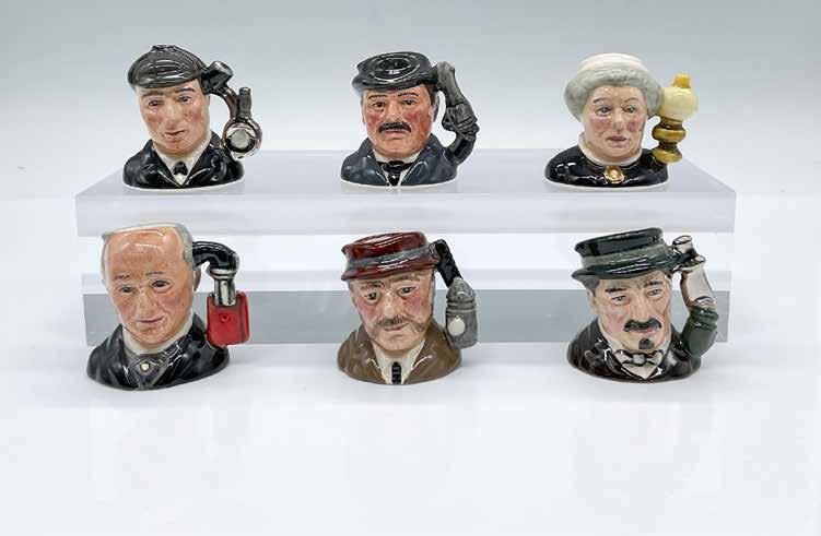 A set of 6 hand painted tiny figural jugs that represents the characters of Sherlock Holmes, a mystery series written by Sir Arthur Canon Doyle. Includes Sherlock Holmes (D7011);
