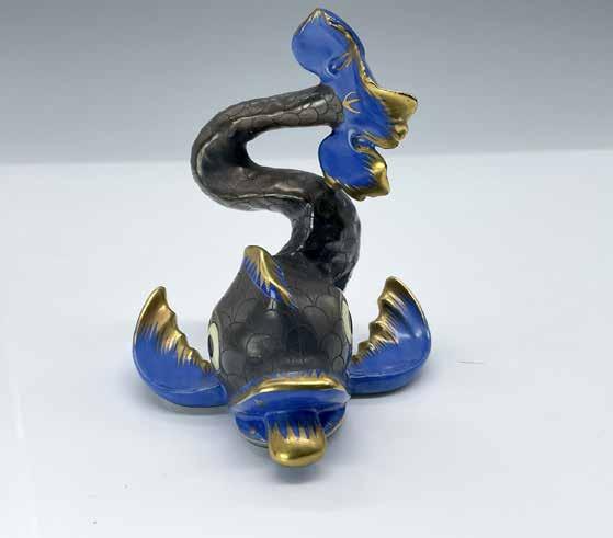 A mythical-style fish with its tongue sticking out. Dark gray with blue and gilded accents. Herend backstamp.