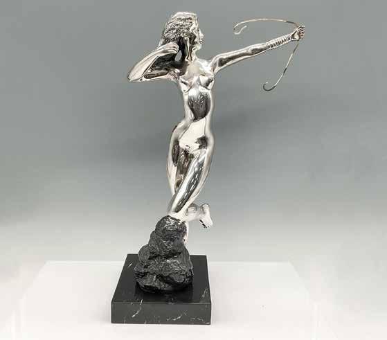Aluminum detailed sculpture of this famous huntress. Set on black molded rock and square marble base, Diana stands tall holding her bow. Felt bottom.
