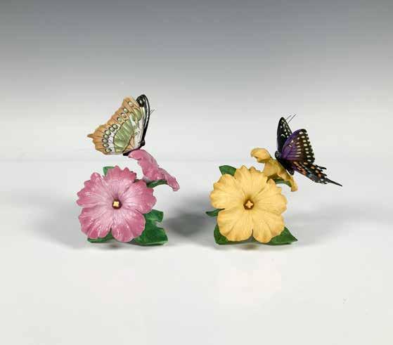 A beautiful naturalistic study of a Palos Verdes blue butterfly resting on a white flower. Boehm backstamp.