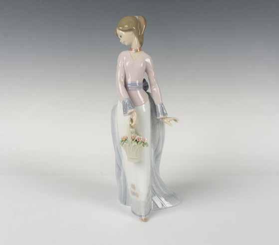 A glossy figure portraying a woman in elegant attire, holding a basket of delicate pink flowers. 1994 Collectors Society. Artists signature at the bottom. Lladro backstamp. This item has its original box:13”L x 7.5”W x 5.75”H.