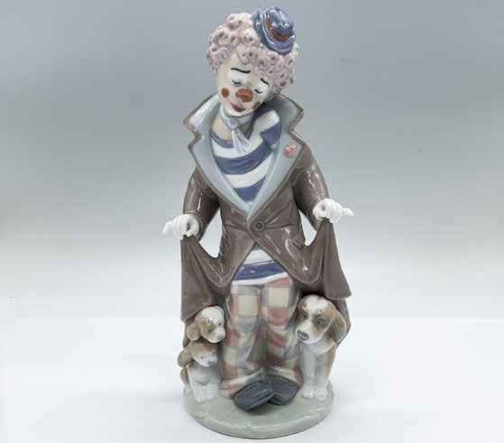 Glossy figure of a clown with three shy puppies. Lladro backstamp.