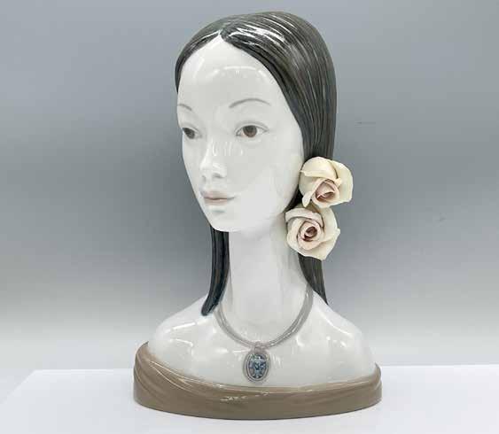 A beautiful glossy bust of was woman with white-pink roses in her hair. Lladro backstamp.