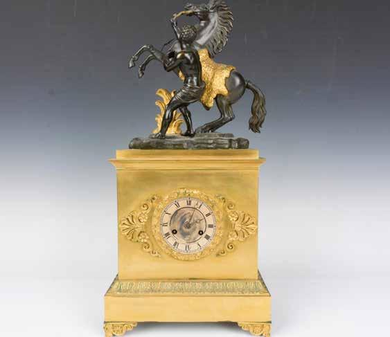Guillaume Coustou the Elder (1677 - 1746) was a French sculptor known for his work in the Baroque and Louis XIV styles. He served as a royal sculptor for both Louis XIV and Louis XV. In 1735, he became the Director of the Royal Academy of Painting and Sculpture. His most famous works are the monumental Carrara marble statues of horses created for the Chateau de Marly, which now have replicas standing in the Place de la Concorde in Paris. These Marly Horses reinvent the theme of the colossal Roman marbles of the Horse Tamers in Rome’s Piazza Quirinale. Commissioned by Louis XV in 1739, they were installed at Marly in 1745 and later moved to the Place de la Concorde after the French Revolution. This mantle clock is an inspired by the statues, in an empirestyle clock, decorated with bronze and gilded figure of a young man taming horses. Weight: 17 lbs.