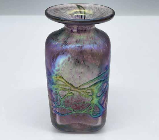 A small square-bodied handblown vase with flared round top crafted from iridescent blue hued glass. Artist signed RHAG on base.