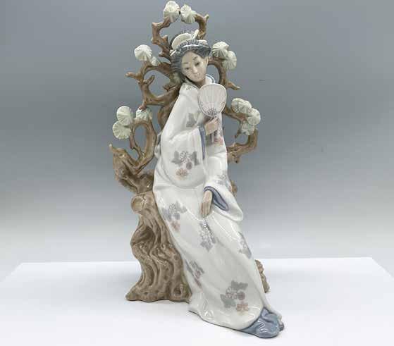 Glossy figure of a beautiful Japanese woman seated on a pine tree. Lladro backstamp.