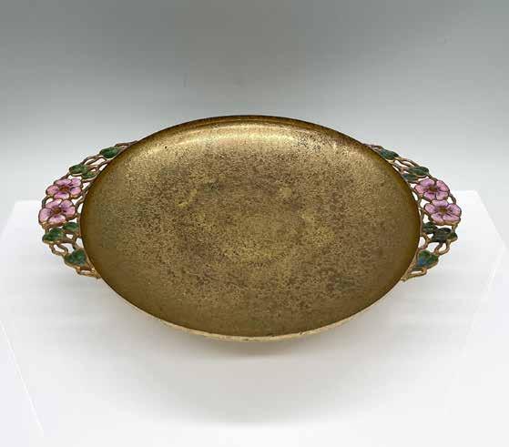A remarkable piece crafted by Louis Comfort Tiffany (American, 1848-1933), features a bronze bowl adorned with favrile enamel. The bowl is approximately 10.2-inches with pink botanical motifs. Impressed stamp on the underside: Louis C. Tiffany Furnaces Inc. Favrile 522.
