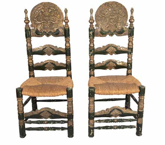 Pair of 18th century hand-painted and hand-carved wood chairs from Mallorca, Spain. The seats are covered with thick natural color rush and the frame is painted black with gilded accents that enhance the shell motifs carved in the backrest.