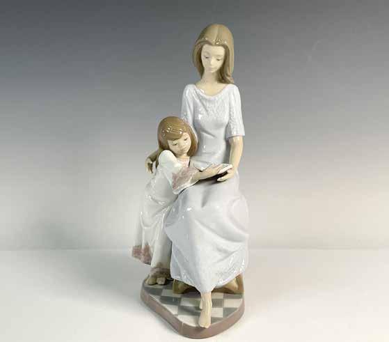 A glossy figurine capturing a tender moment as a mother reads a book to her daughter. Lladro backstamp. This item has its original box: 13.5”L x 8”W x 9.25”H.