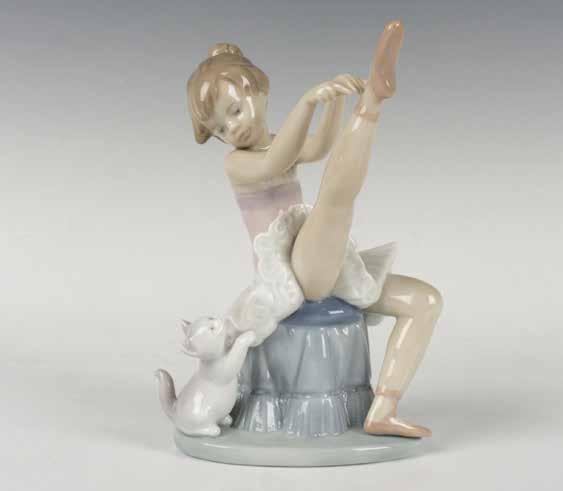 A glossy figure of a young ballerina with her curious cat. Lladro signature at the bottom. Lladro backstamp. This item has its original box: 10”L x 9”W x 6.25”H.
