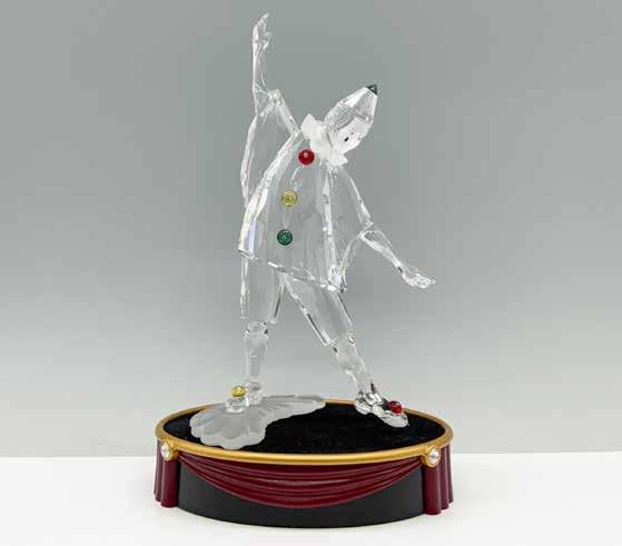 A jester figure striking an openarmed pose, complemented by green, red, and yellow crystals joined by an oval base with a drawn curtain. Swarovski backstamp. This item has its original box. Dimensions of the box: 10”L x 6”W x 5.5”H. This item has a base included. Certificate of Authenticity included.
