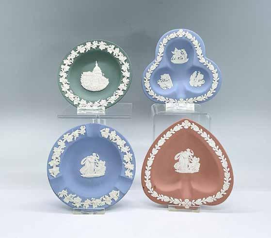 Matte stoneware dishes with white sprigged decoration in low-relief. Wedgwood backstamp. Sage green round with images of US Supreme Court and Capitol buildings 0.5”H x 4.5”dia. Blue round, blue club shape and pink spade shape with neoclassical images. Wedgwood stamp.