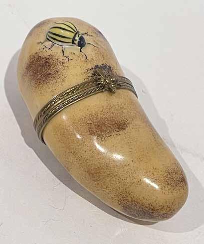 Hand painted in Limoges France, completed by a metal closure. The walnut includes a little porcelain kernel inside. Signed Peint Main Limoges France M.B.