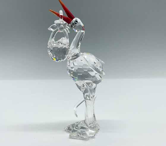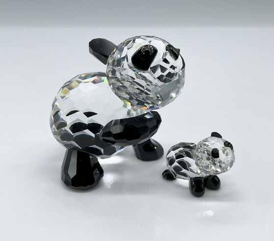 This pair of animal figurines features a Kangaroo Mom with a baby joey, both crafted from clear crystal and adorned with black eyes. Also included in this set, from the African Wildlife theme group, is a Swarovski crystal baby giraffe. The giraffe has a clear crystal body, with its mane and horns made from frosted crystal. The Largest piece measures 4’’L x 1.5’’W x 5.5’’H. Swarovski etched backstamp.