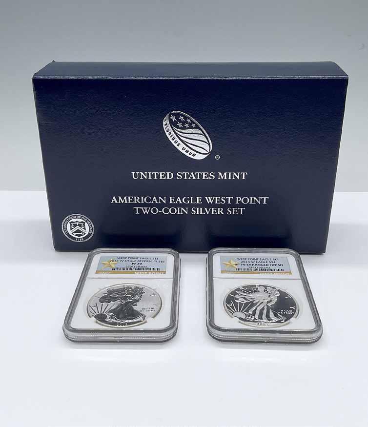 A set of 2 beautiful West Point Mint silver coins, NGC Graded, Proof PF70 and Enhanced Finish SP70. The obverse side depicts the full length figure of Liberty holding the flag, and branches of oak and laurel in her hands. The reverse side features the heraldic eagle with shield, an olive branch and arrows. The two coins protected in