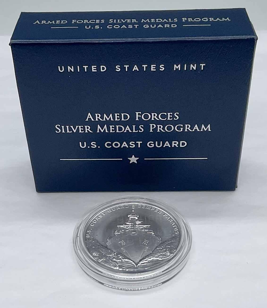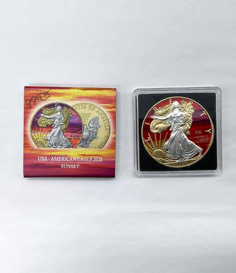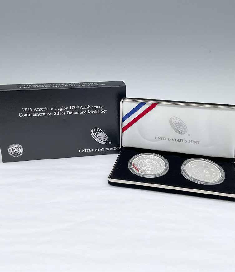 Anniversary coin. The obverse design depicts the profile of Liberty in a cap with a small floral crown. The reverse design is a bald eagle clutching arrows and a branch. The coin is in a protective case. Approximate measurement of a case: 0.25”D x 1.75” dia. This item has its original US Mint Packaging: 3.75”L x 3.5”W x 1”H.