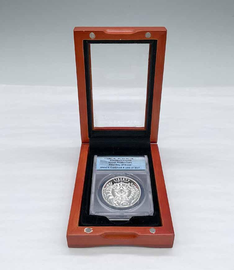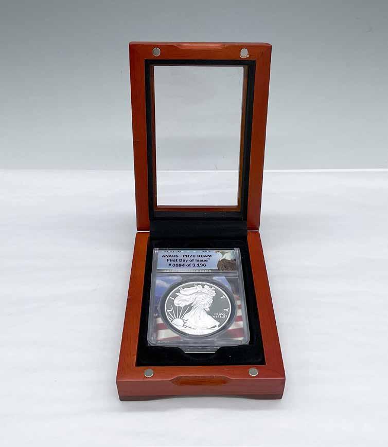 PCGS Graded and Slabbed PR70 DCAM. The obverse side depicts the full length figure of Liberty holding the flag, and branches of oak and laurel in her hands. The reverse side features the heraldic eagle with shield, an olive branch and arrows. Silver coin stored in a clear protective case. This item has its a box: 6”L x 4.25”W x 1”H.