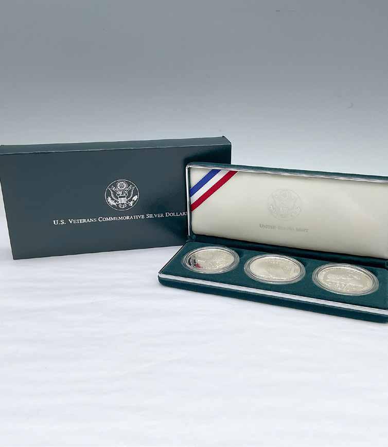 Reverse Proof San Francisco Mint, Anniversary Coins. The set includes Morgan Silver Dollar, with the obverse design depicts the profile of Liberty in a cap with a small floral crown. The reverse design is a bald eagle clutching arrows and a branch. The Peace Silver Dollar, with the observe of Liberty in a radiant crown. The reverse of an