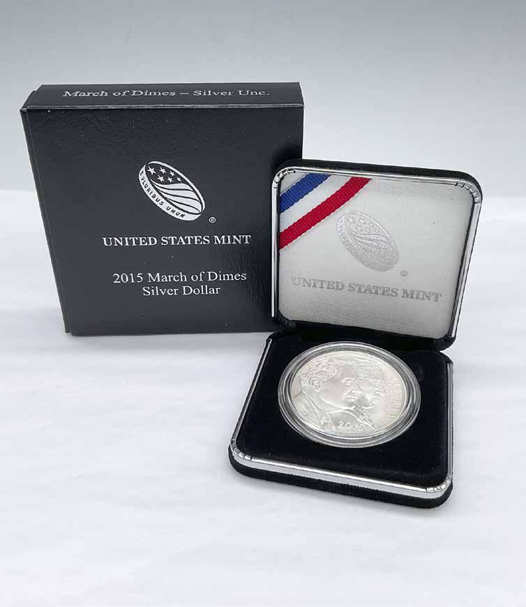 Includes 2015 West Point Mint March of Dimes Silver Dollar, the obverse side depicts a profile view of President Franklin Roosevelt and Dr. Jonas Salk, the two leaders in the fight against polio, and the reverse side design depicts a baby cuddled in the hand of a parent. The second and the third coins feature a 2015 West Point Proof and Philadelphia Reverse Proof Mint Franklin D. Roosevelt dimes, the obverse design
