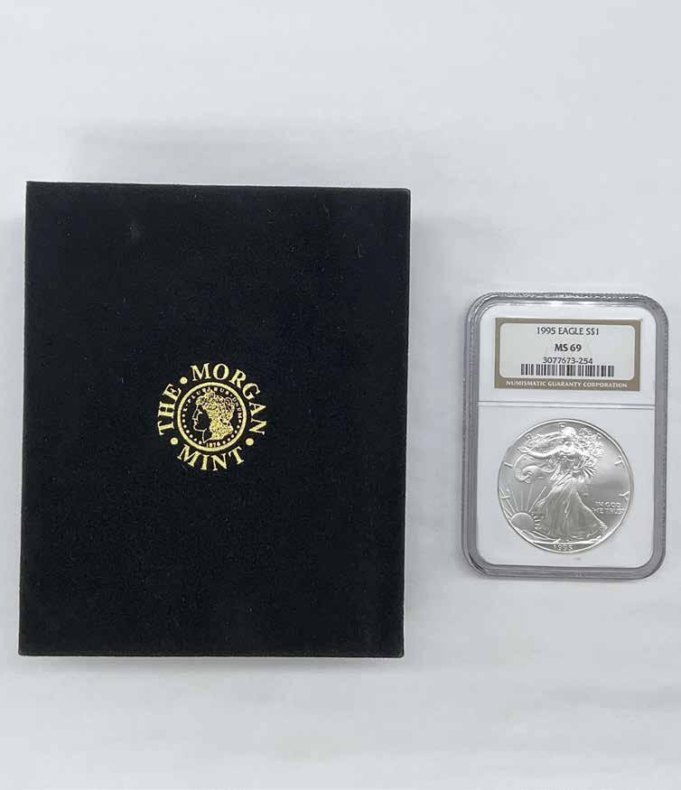 Slabbed and Graded MS65 Certified from U.S. Treasury Bag New York Bank Hoard. The obverse features the profile of Liberty, and the reverse side is an eagle holding an olive branch and arrow. Silver dollar stored in a clear protective case. Approximate measurement with the case: 2.5”L x 0.5”W x 3.5”H.
