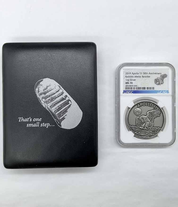 NGC Graded and Slabbed MS70. Commemorating the 50th anniversary of Apollo 11 mission landing on the moon. This particular silver features the exact same medal design that was given to Neil Armstrong, Michael Collins and Buzz Aldrin. The obverse depicts an American Bald Eagle on the moon surface and