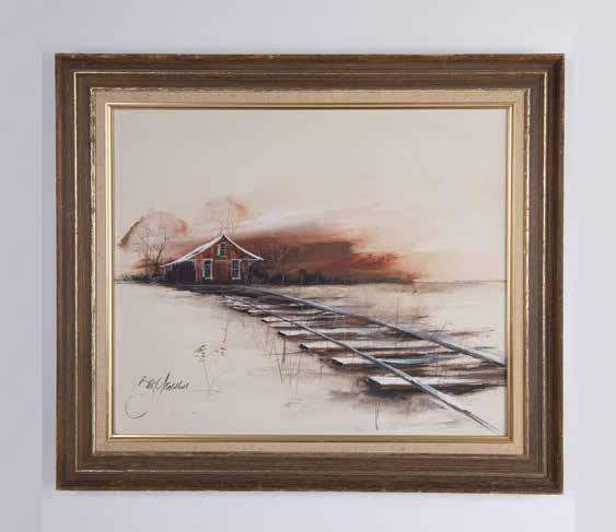 Original oil on canvas of a snowy landscape made with a palette knife and thinly applied brushstrokes for minimal details. The artist focuses on single train tracks that leads to an isolated station in a baren land painted in rust and warm browns with an off-white snow covered space. Signature on lower left: illegible. Housed in a natural wood and gilt frame with an ecru linen mat. Artwork Dimensions: 23.25”L x 19.25”H. Frame Dimensions: 30”L x 26”H x 2”W.
