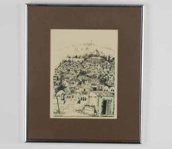 Original engraving on board of Jerusalem that Contemporary Israeli artist and designer David Harel enhanced with light blue-green tints. Harel has collaborated on artistic projects with the Israel Museum, the Symphony Orchestra, the Jerusalem Municipality, and the Israel Festival, and his studio is one of the oldest in Jerusalem’s Hutzot Hayotzer. Signature on left side: Harel illegible. Housed in a metallic frame with a black mat. Sight size: 6.75”L x 9”H. Frame size: 11.75”L x 13.75”H x 1”W.