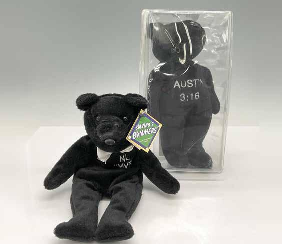 Black bear with embroidered 21 NL MVP on front with Sosa 21 on back. Savino’s Bammers swing tag. Stone Cold Steve Austin black bear Austin 3:16 embroidered on front, 100% Whoop Ass on back. Comic Images Duo Cards official card. This item has its original box:4.75”L x 8.75”W x 3”H.