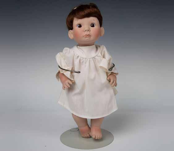 Made of vinyl with charming features like rosy cheeks, big eyes, and mischievous grins. Dressed in a simple gown and includes attachable wings with a tiny Bible. This item has its original box which measures 6.5”L x 5”W x 19.25”H. Certificate of Authenticity included.