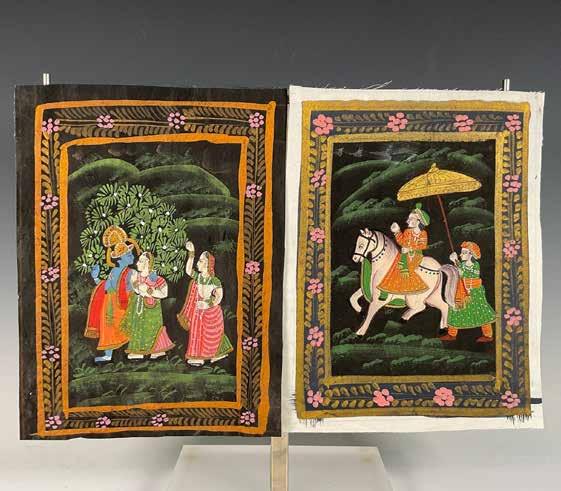 Set of two original hand-painted miniature scenes of Hindu Lord Krishna with two Gopis and Raja Riding a White Horse with a Servant. These exotic paintings are made with white, green, gold, orange and pink colors that are set on black colored fabrics with floral borders. Each artwork: 8.75”L x 11.50”H.