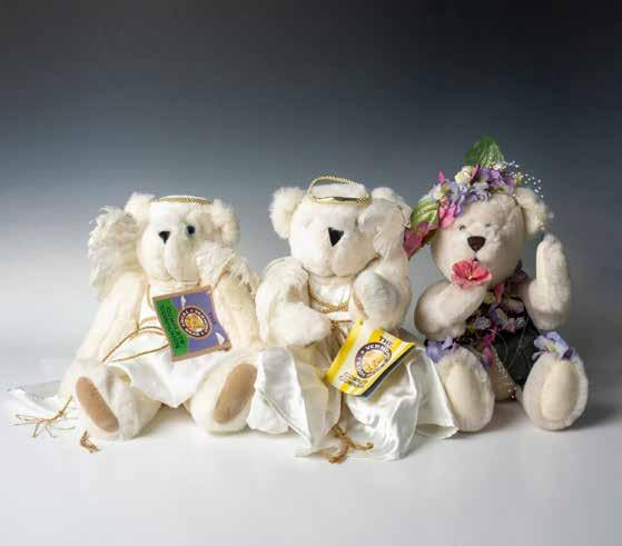 This adorable group includes: Two Vermont Angel bears, featuring white shiny angelical attire crowns and angel wings. Including their original tags, and one of them, a wooden and metal stand holder; Alongside an Applause articulated bear with movable paws, decorated with pink and purple shiny flowers and completed by fairy wings. Largest piece Dimensions: 8’’L x 9.5’’W x 17.5’’H.