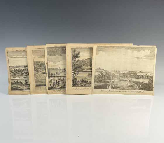 Group of five original antique engravings on brown paper published in The Universal Magazine of Knowledge and Pleasure by John Hinton in 1748-1750. They include: A View of London from One-TreeHill in Greenwich Park; A View of the Public Fireworks Ordered for the General Peace; Illuminations and Fire-Works to be Exhibited in Dublin on the Thanksgiving Day of General Peace; The South East Prospect of Colchester in the County of Essex; and North Prospect of Castle Hill in Devonshire. Average engravings