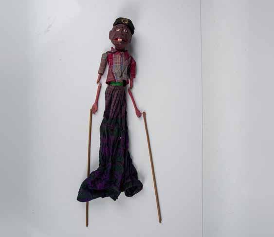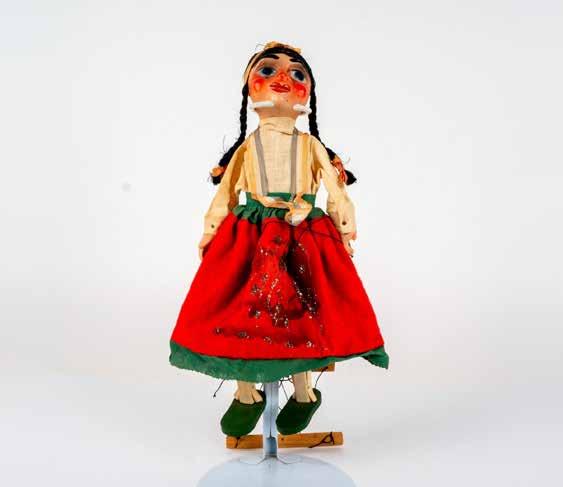 Female Marionette dressed in costume with straw hat, a full red skirt and green shoes with attached wood and string. Hand crafted in Mexico and was given to Frances F. Switt during her travels in South and Central America in the 80s and 90s.