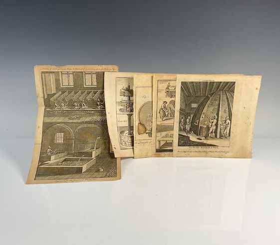 Group of five original antique engravings on brown paper published in The Universal Magazine of Knowledge and Pleasure by John Hinton in 1747-1750. They include: Silk-Windles or the Method of Winding and Twisting of Silk for the Weavers; A Wine Press and a Juice Press; The Art and Mystery of Making Wax and Tallow Candles; Manner of Sorting Linen Rags, Method of Fermenting them to Make Paper; and The Glass-Makers at Work. Average engravings