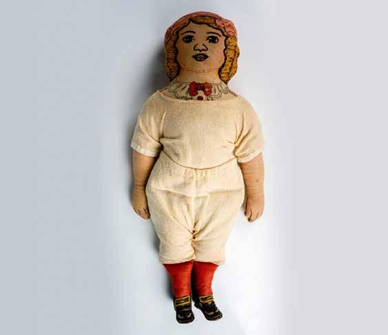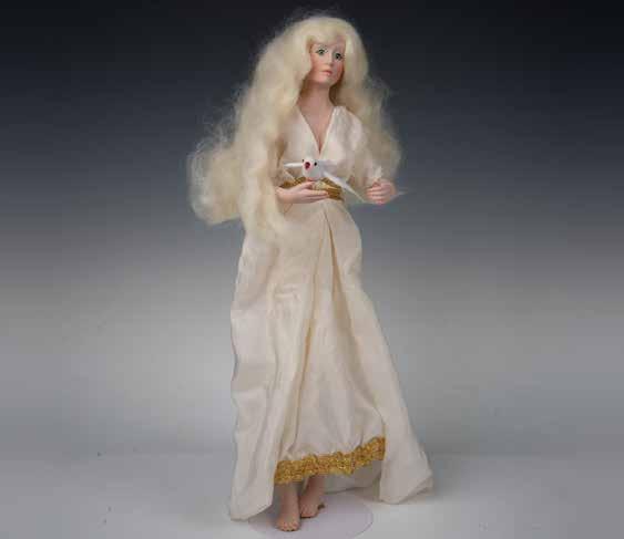 Doll with blond hair in a cream colored dress with gold bodice tie and trim. Porcelain head, partial torso, hands and legs. This item has its original box: 8.5”L x 21.5”W x 7”H.