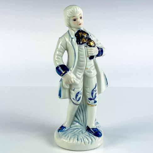 Ceramic figurine modeled as young gentleman in 18th century style dress. Blue underglaze with gold gilt details. Unmarked. This item has no reserve.