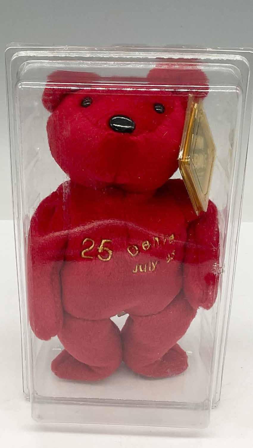 Red plush beanie with 25 Denver July 98 embroidered on front with McGwire 25 on back. Salvino’s Bamm Beanos swing tag. This item has its original box: 4.75”L x 8.75”W x 3”H.