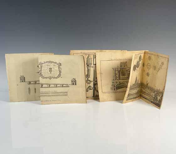 Group of five original antique engravings on brown paper published in The Universal Magazine of Knowledge and Pleasure by John Hinton in 1747-1750. They include: The Causes of Eclipses and the Motion of the Earth; A Draught and the Use of Several Sorts of Ploughs in England; The Ribbon Weaver and his Loom; A True Representation of Microscopes and their Proper Aparatus (sic); and A Plan & Elevation of the Bridge built over the River Loire at Blois in France.