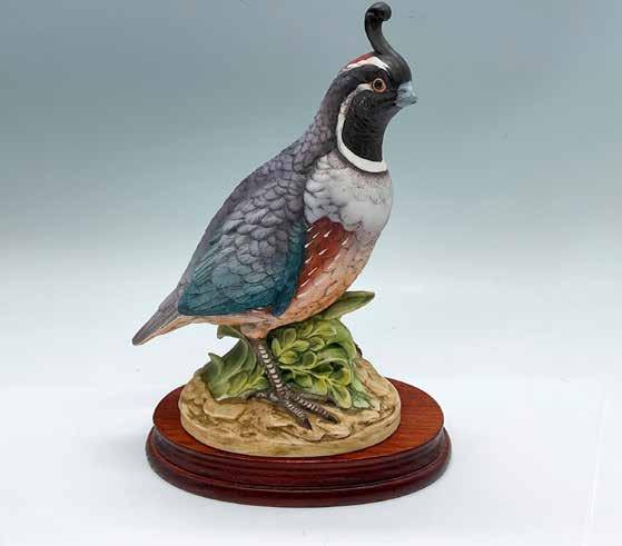 Hand painted naturalistic figure of a male Velley quail. Males have a light brown belly, a dark brown cap and a black face with a brown back and a grey-blue chest. It is the state bird of California. Andrea marked. This item has a base included: 7.25”L x 4.25”W x 1”H.