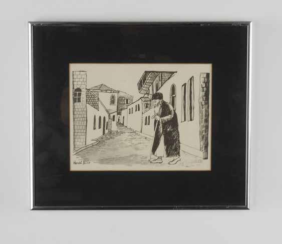 Original engraving on board of an elder Jewish man walking in the old City of Jerusalem by Contemporary Israeli artist and designer David Harel. He has collaborated on artistic projects with the Israel Museum, the Symphony Orchestra, the Jerusalem Municipality, and the Israel Festival, and his studio is one of the oldest in Jerusalem’s Hutzot Hayotzer. Signature on left side: Harel illegible. Housed in a metallic frame with a black mat. Sight size: 9”L x 6.75”H. Frame size: 13.75”L x 11.75”H x 1”W.