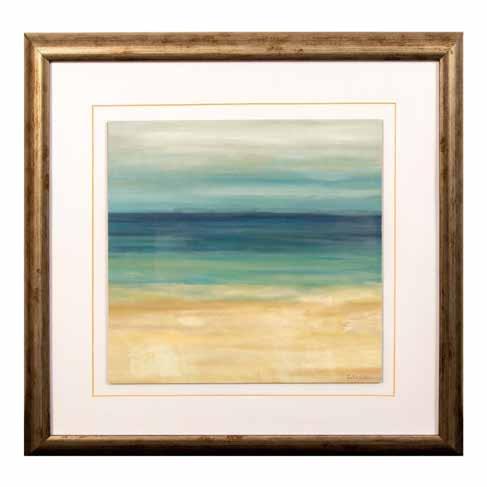 Framed decorative color print on board from Cynthia Coulter’s Navy Blue Horizon series. Mounted on white mat board housed in a brushed silver color frame. Signature in print on lower right: Cynthia Coulter. Sight size: 11.75”L x 12”H. Frame size: 19”L x 19”H x 1”W.